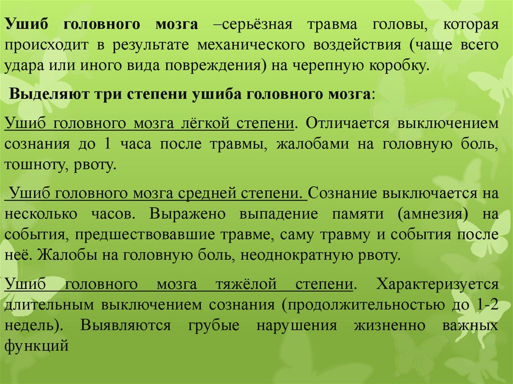 Ушиб головного мозга –серьёзная травма головы, котораяпроисходит в результате механического воздействия (чаще всего