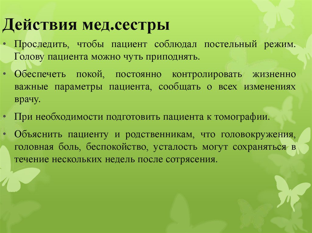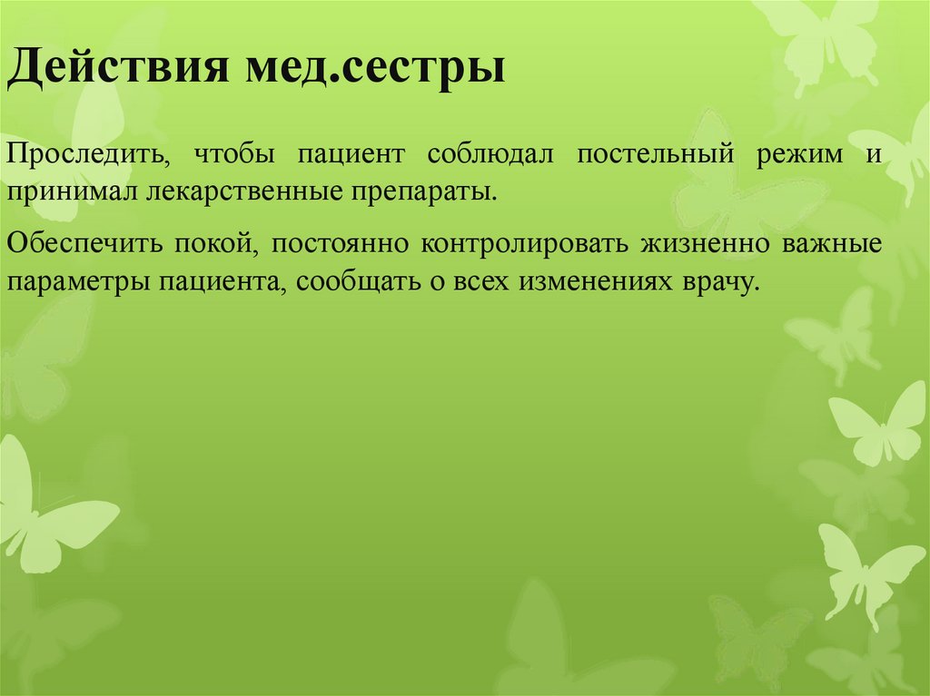 Действия мед.сестры• Проследить, чтобы пациент соблюдал постельный режим.