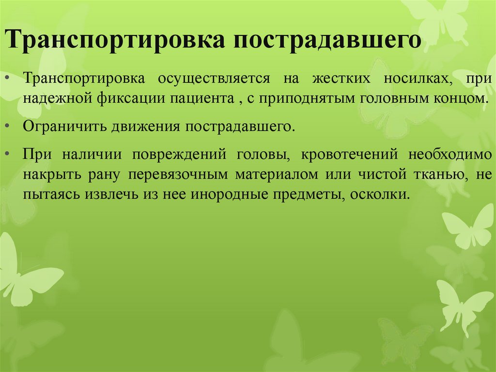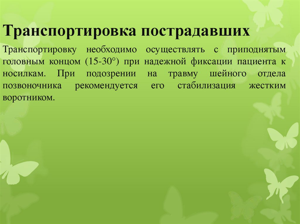 Транспортировка пострадавшихТранспортировку необходимо осуществлять с приподнятым