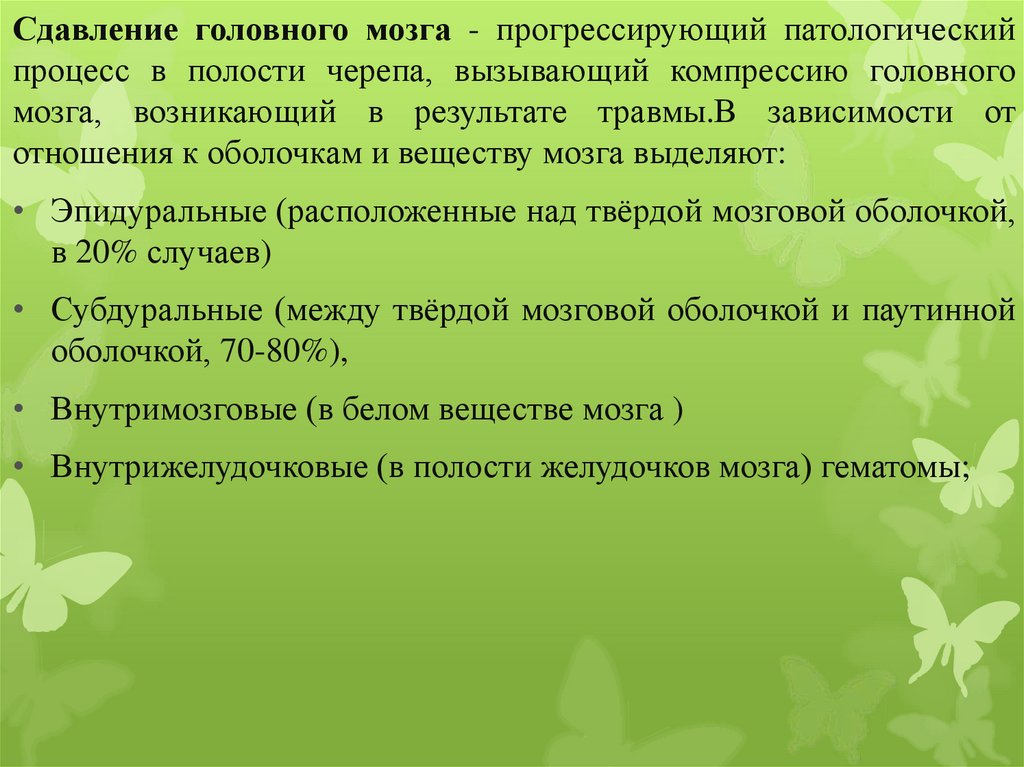 Сдавление головного мозга - прогрессирующий патологическийпроцесс в полости черепа, вызывающий компрессию головного