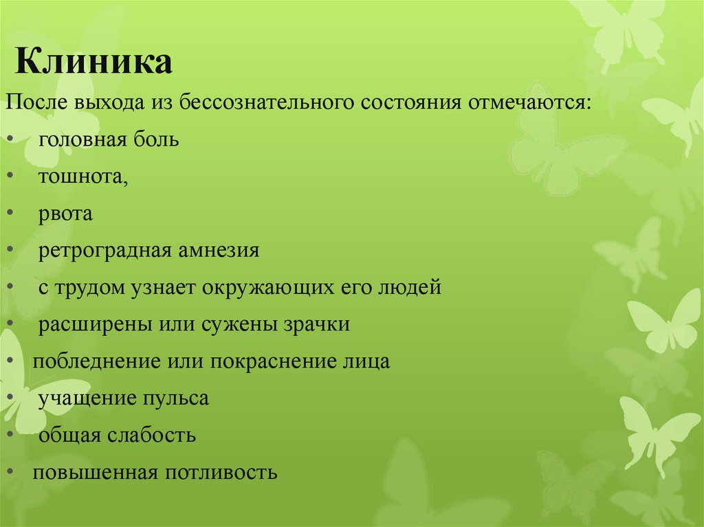 КлиникаПосле выхода из бессознательного состояния отмечаются: