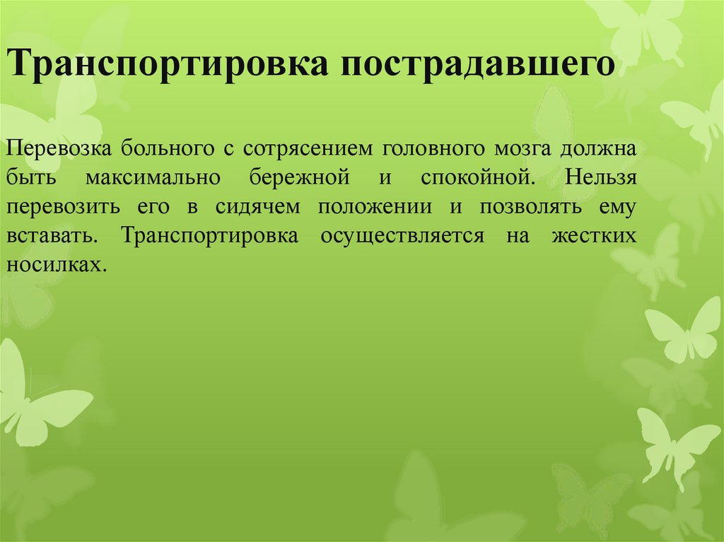 Транспортировка пострадавшегоПеревозка больного с сотрясением головного мозга должна