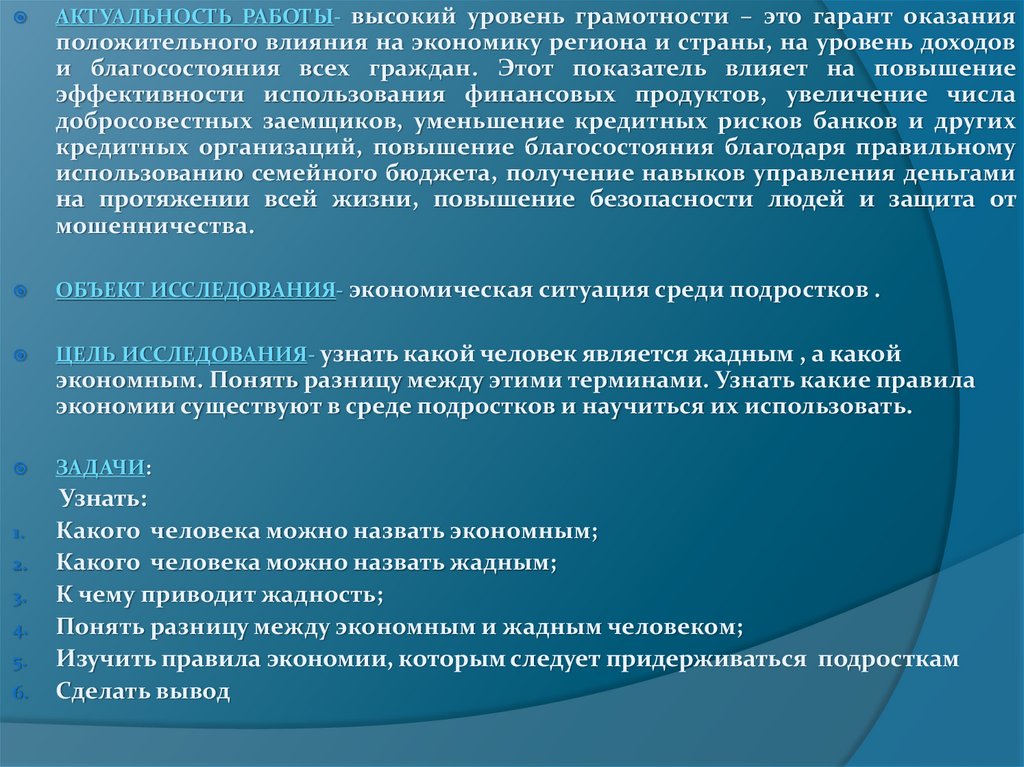 АКТУАЛЬНОСТЬ РАБОТЫ- высокий уровень грамотности – это гарант оказанияположительного влияния на экономику региона и страны, на уровень доходов