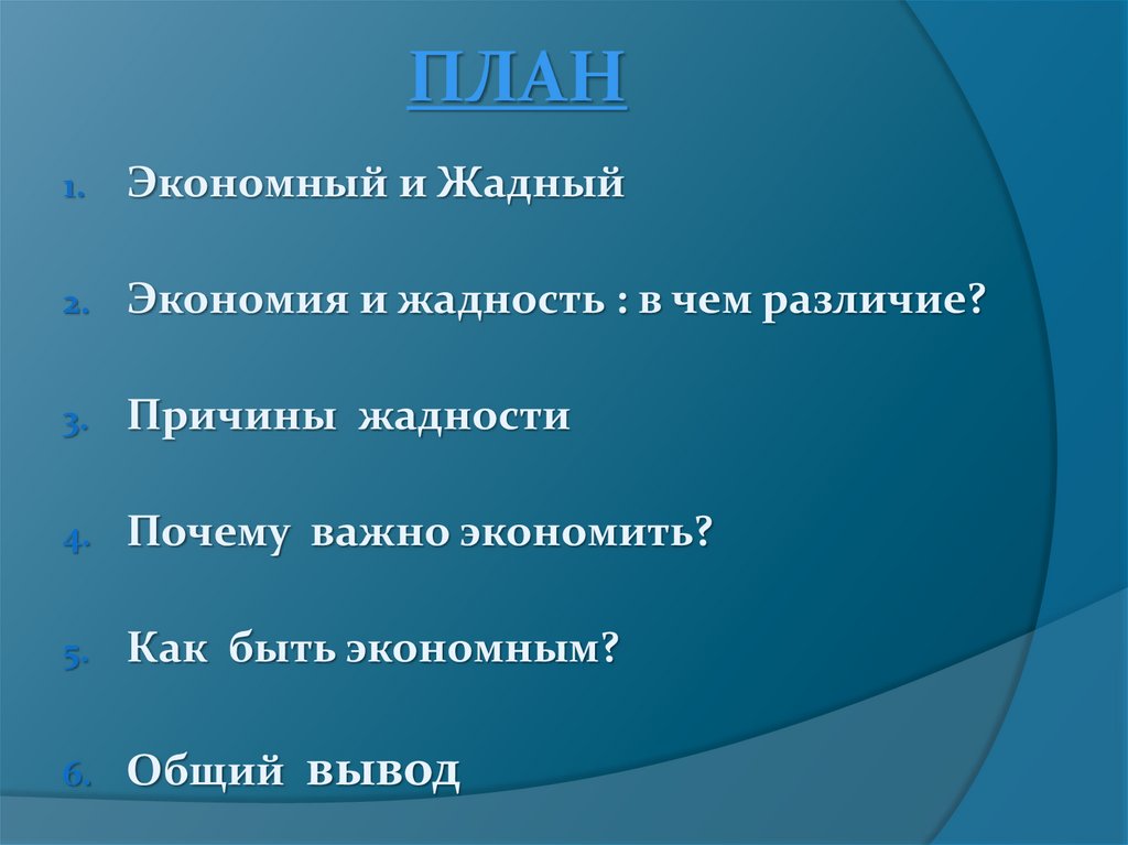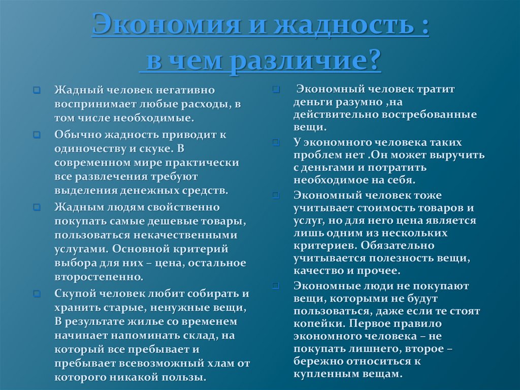Понять разницу между экономным и жадным человеком;