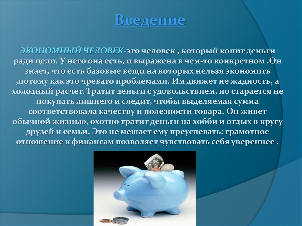 ВведениеЭКОНОМНЫЙ ЧЕЛОВЕК-это человек , который копит деньги
