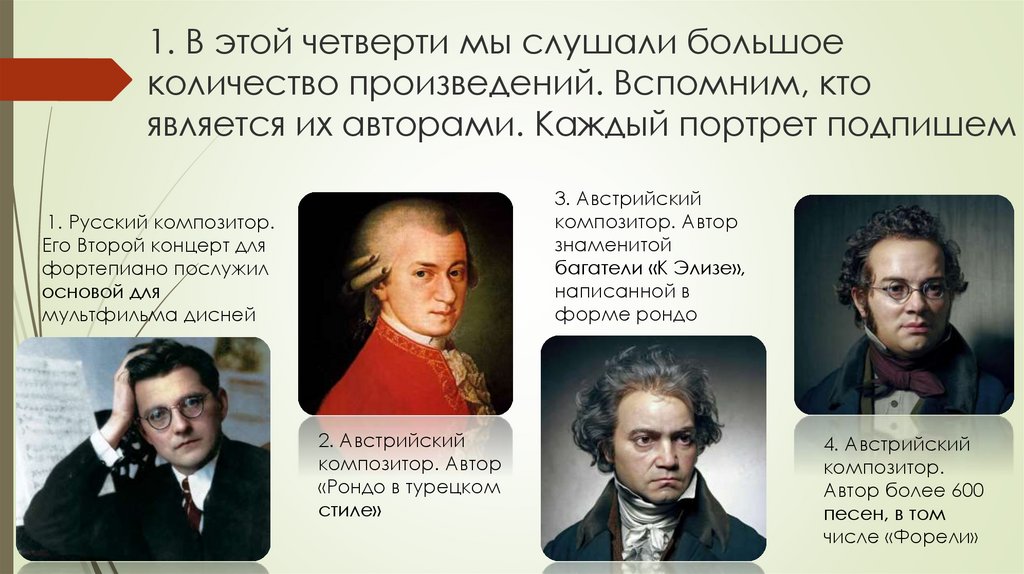 1. В этой четверти мы слушали большоеколичество произведений. Вспомним, кто