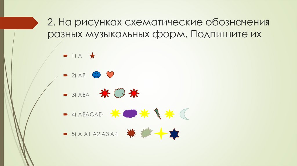 2. На рисунках схематические обозначенияразных музыкальных форм. Подпишите их