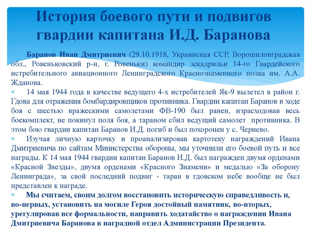История боевого пути и подвиговгвардии капитана И.Д. Баранова