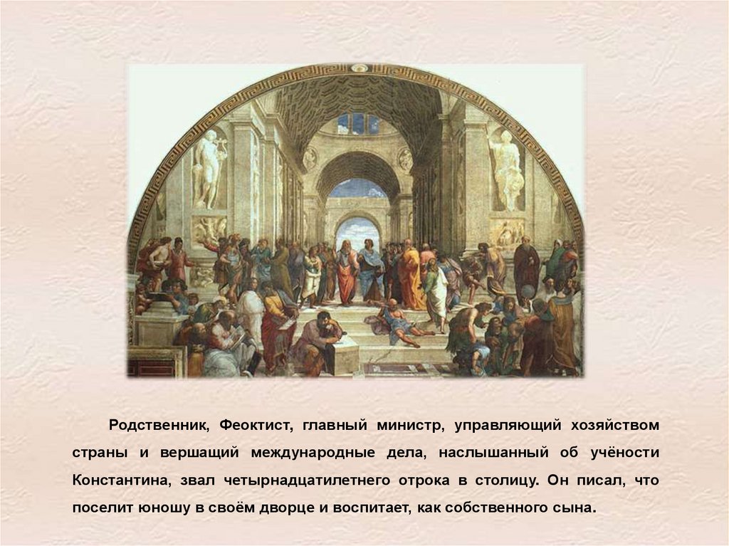 Родственник, Феоктист, главный министр, управляющий хозяйствомстраны и вершащий международные дела, наслышанный об учёности