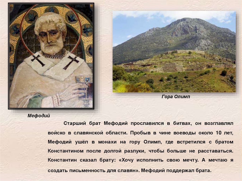 Мефодий ушёл в монахи на гору Олимп, где встретился с братом
