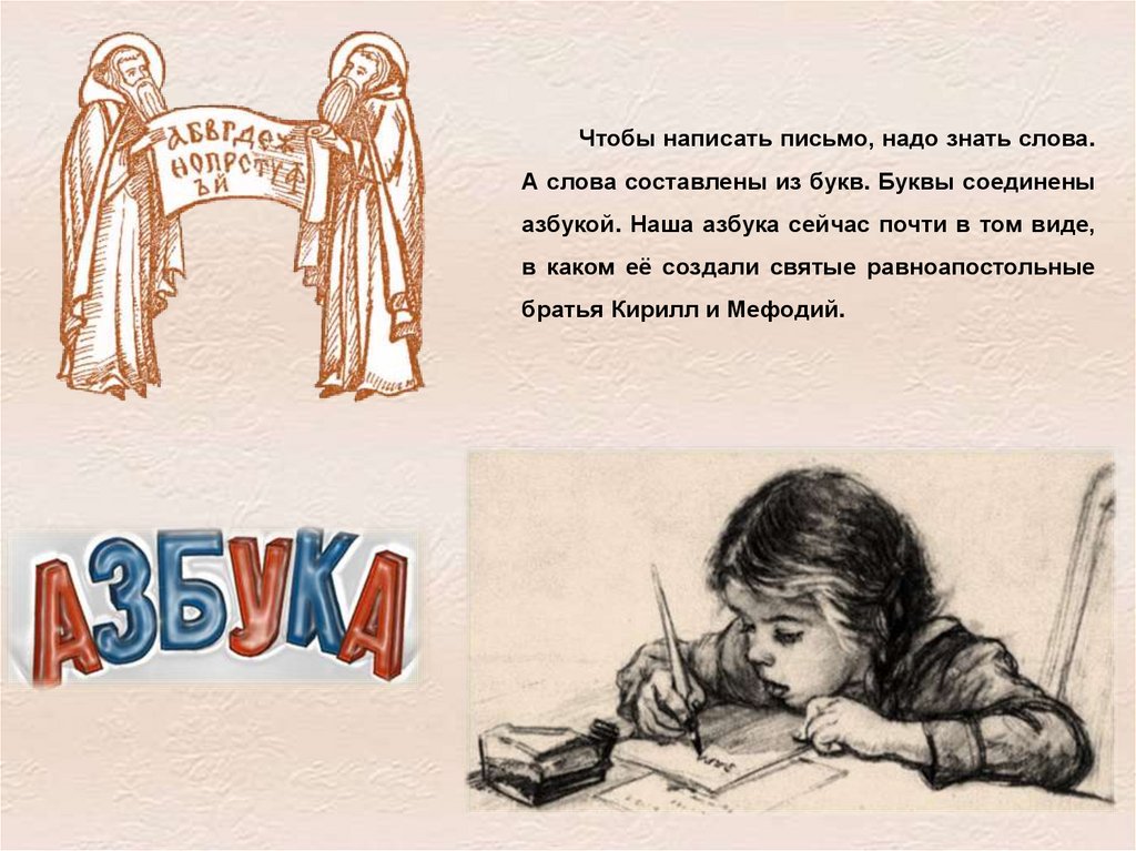 Чтобы написать письмо, надо знать слова.А слова составлены из букв. Буквы соединены