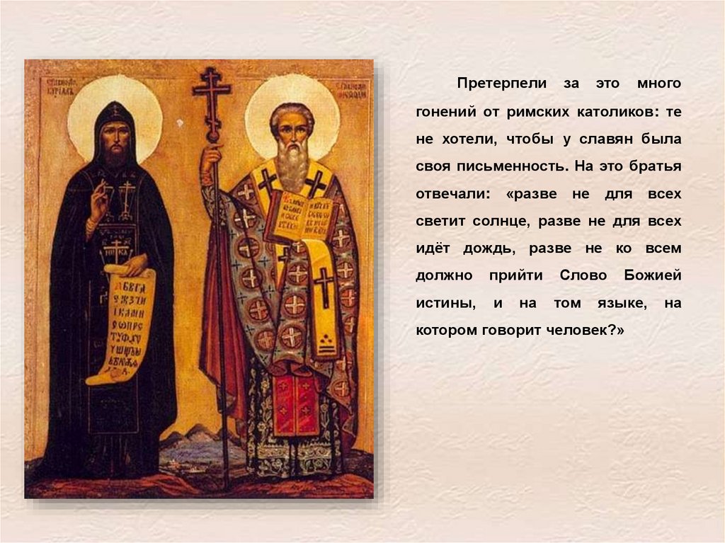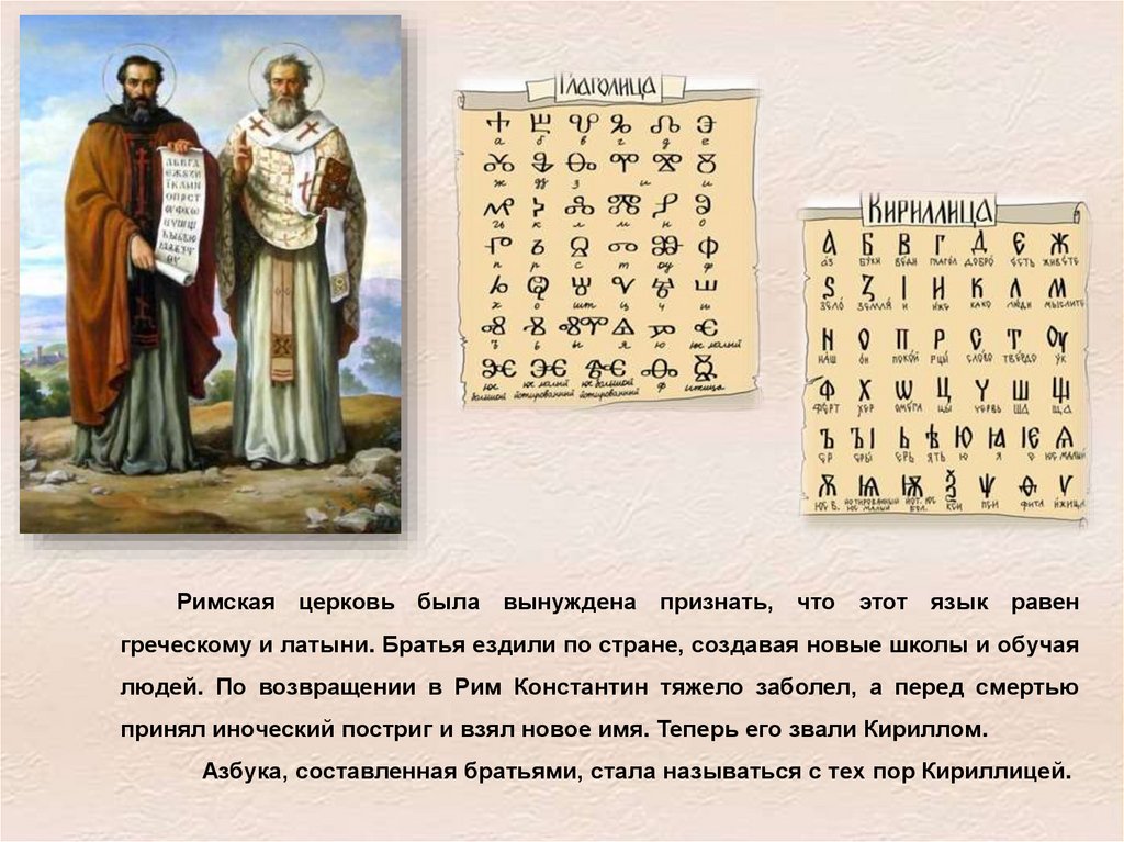 Римская церковь была вынуждена признать, что этот язык равенгреческому и латыни. Братья ездили по стране, создавая новые школы и обучая