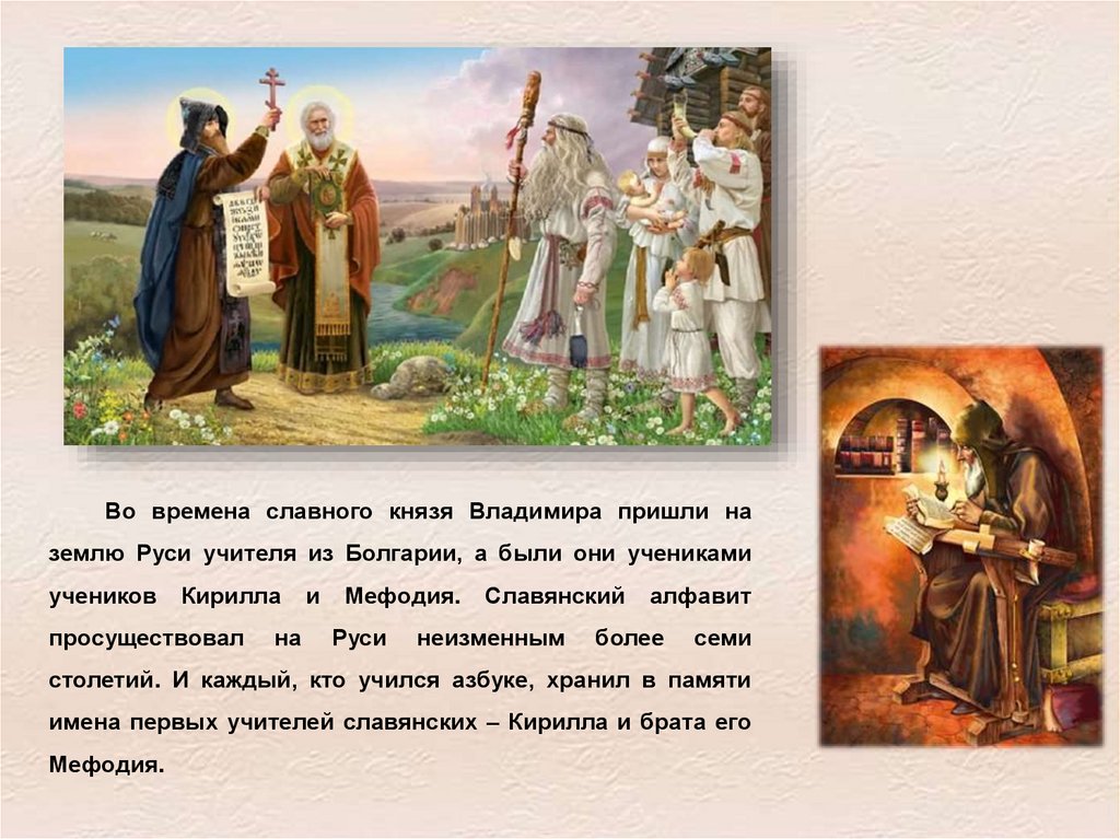 Во времена славного князя Владимира пришли наземлю Руси учителя из Болгарии, а были они учениками