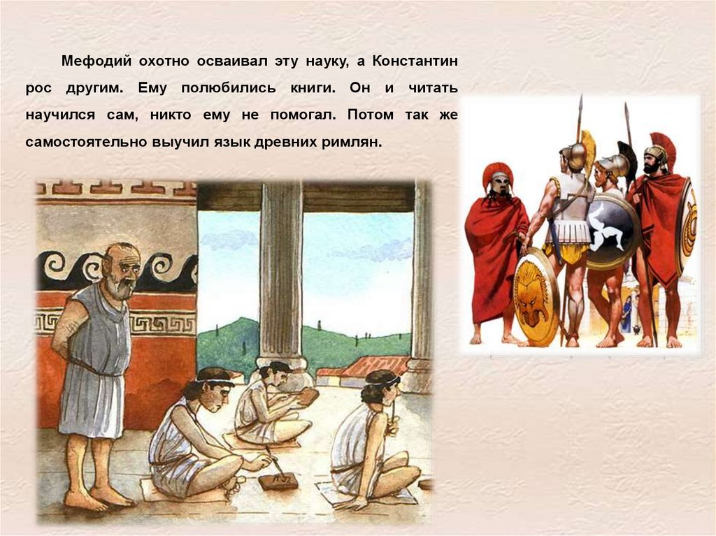 Мефодий охотно осваивал эту науку, а Константинрос другим. Ему полюбились книги. Он и читать
