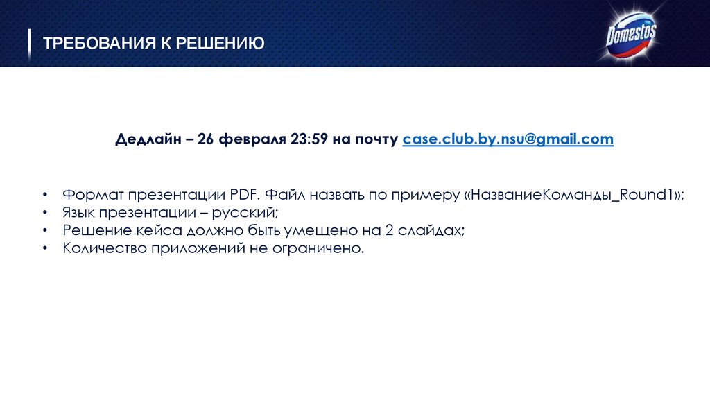 ТРЕБОВАНИЯ К РЕШЕНИЮДедлайн – 26 февраля 23:59 на почту case.club.by.nsu@gmail.com