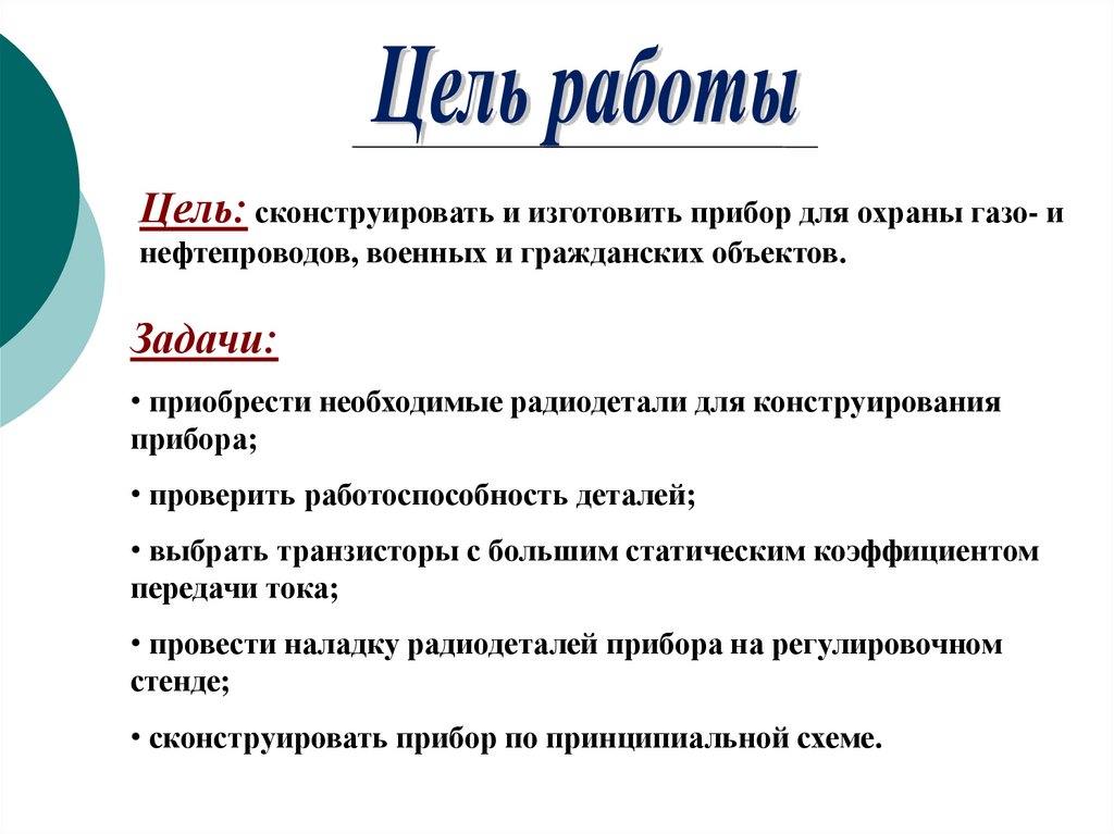 Цель: сконструировать и изготовить прибор для охраны газо- инефтепроводов, военных и гражданских объектов.