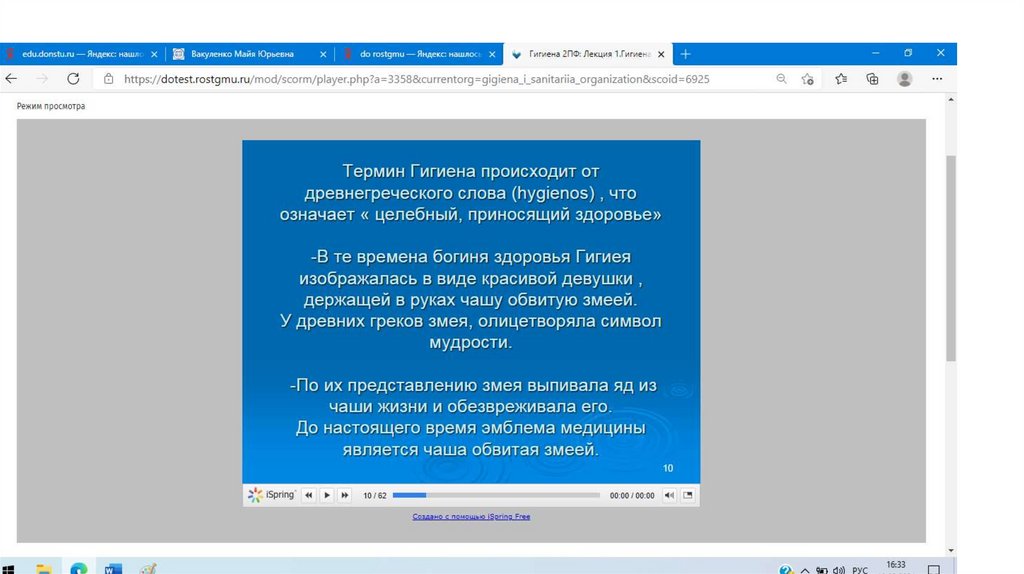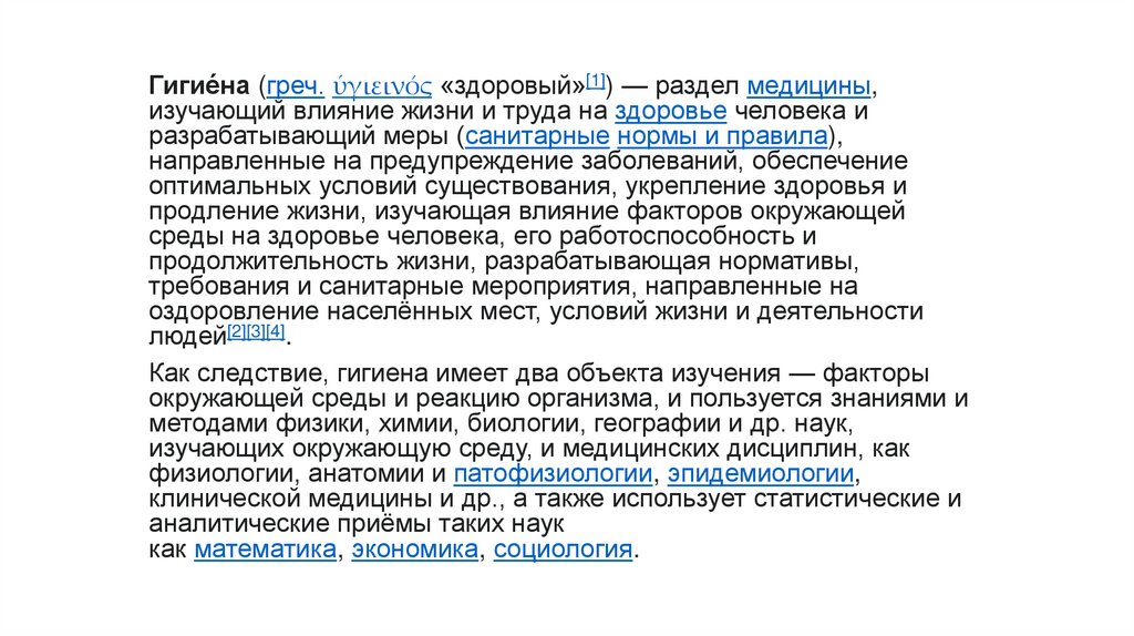 Гигие́на (греч. ὑγιεινός «здоровый»[1]) — раздел медицины,изучающий влияние жизни и труда на здоровье человека и