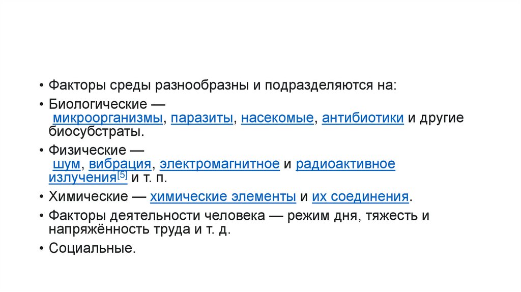 • Факторы среды разнообразны и подразделяются на:• Биологические —
