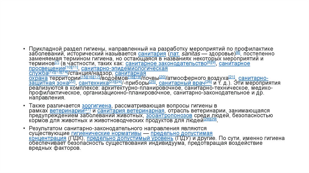 • Прикладной раздел гигиены, направленный на разработку мероприятий по профилактикезаболеваний, исторический называется санитария (лат. sanitas — здоровье)[6], постепенно