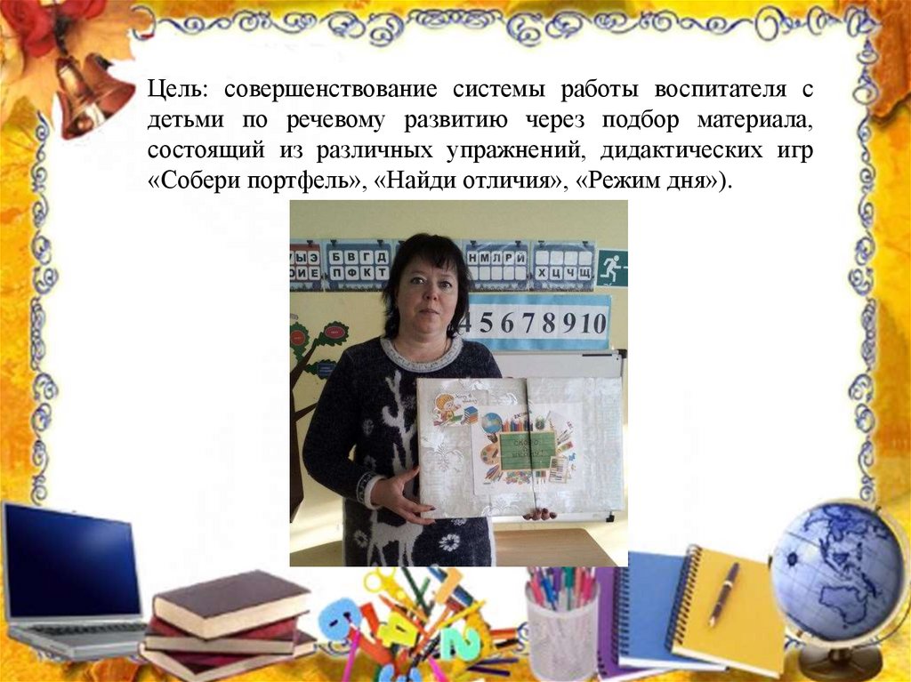 Цель: совершенствование системы работы воспитателя сдетьми по речевому развитию через подбор материала,
