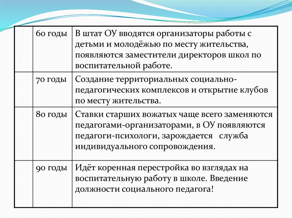 60 годы В штат ОУ вводятся организаторы работы сдетьми и молодёжью по месту жительства,