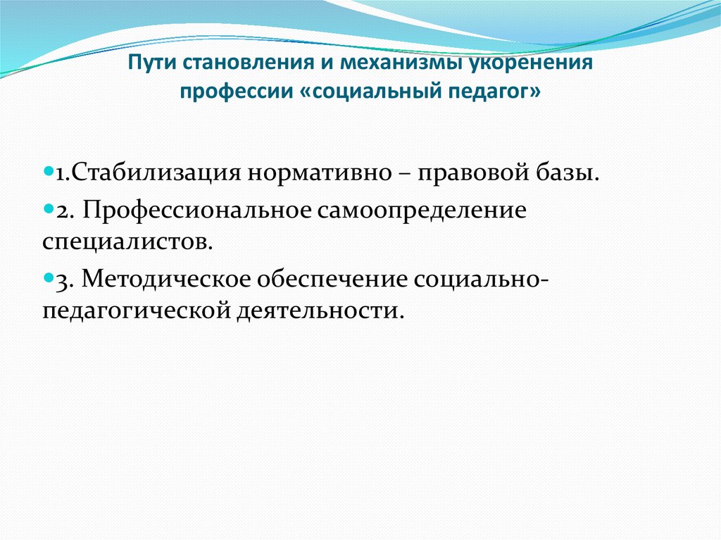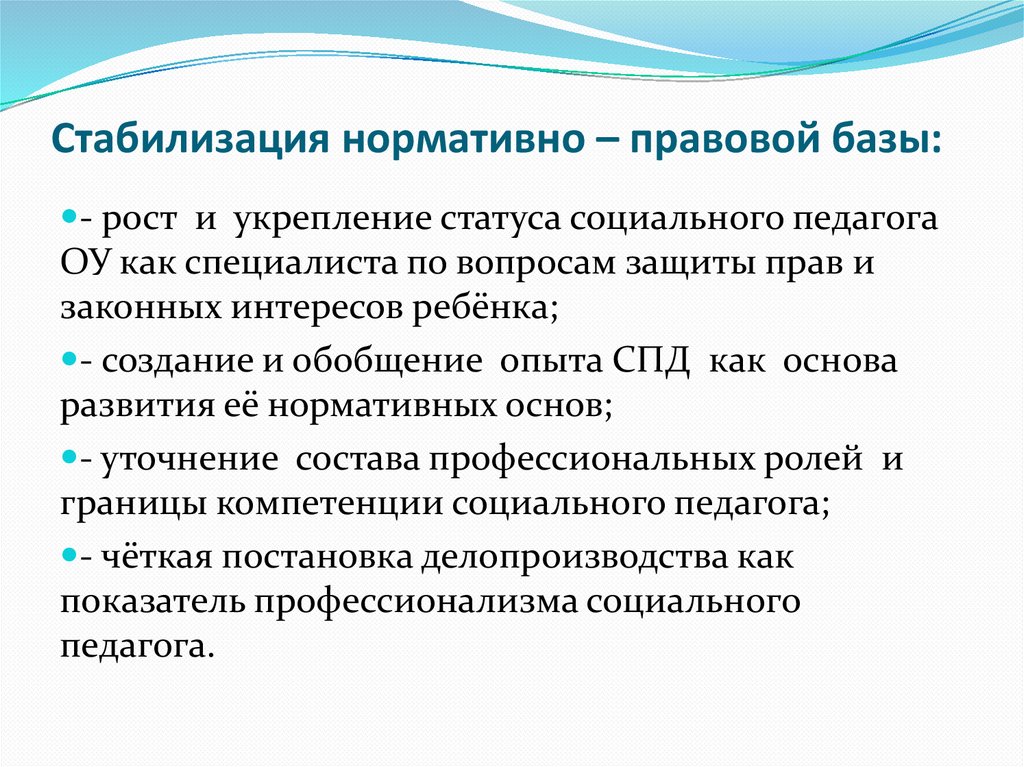 Стабилизация нормативно – правовой базы:- рост и укрепление статуса социального педагога