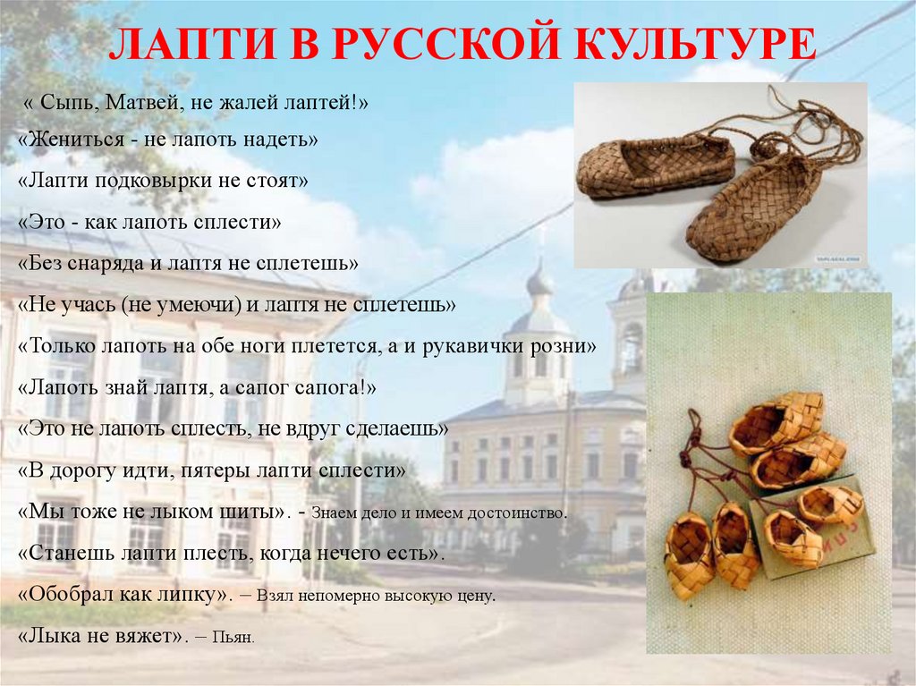 ЛАПТИ В РУССКОЙ КУЛЬТУРЕ« Сыпь, Матвей, не жалей лаптей!»