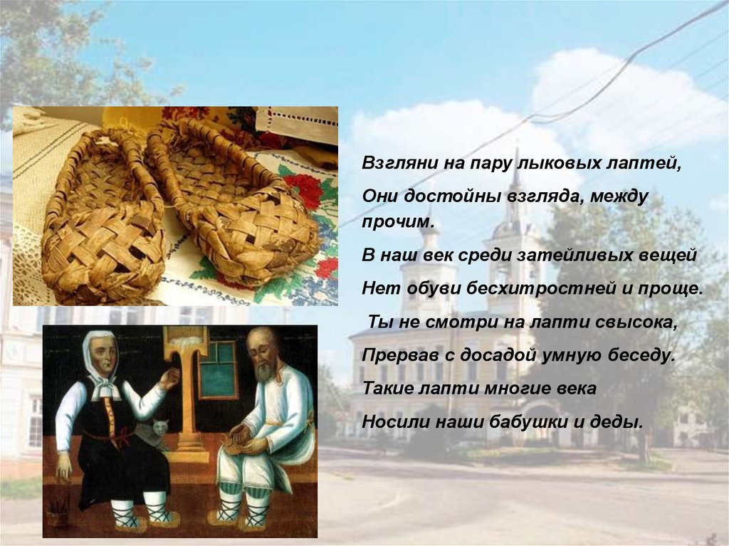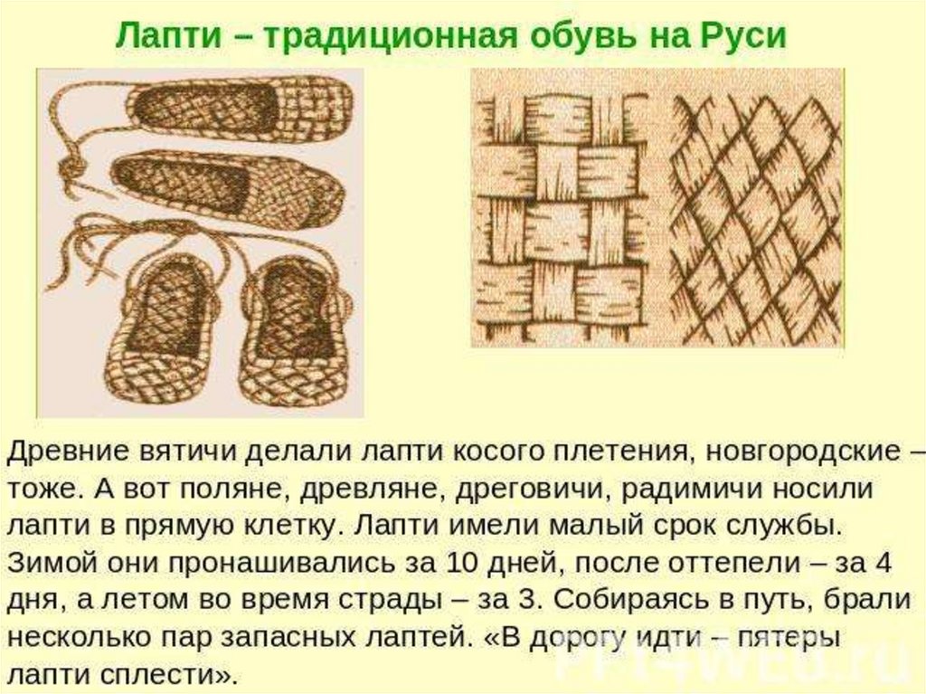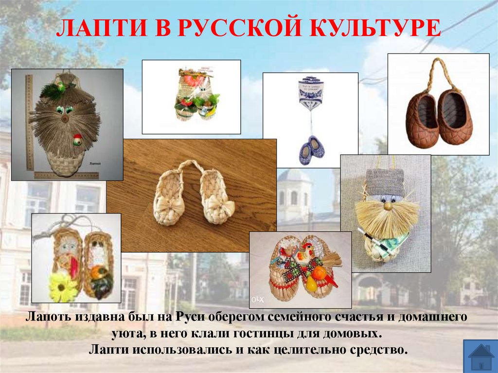 ЛАПТИ В РУССКОЙ КУЛЬТУРЕЛапоть издавна был на Руси оберегом семейного счастья и домашнего