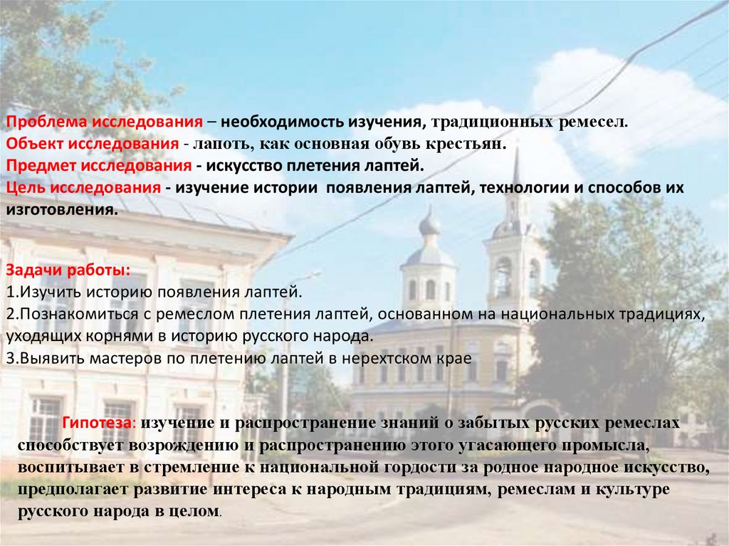Проблема исследования – необходимость изучения, традиционных ремесел.Объект исследования - лапоть, как основная обувь крестьян.