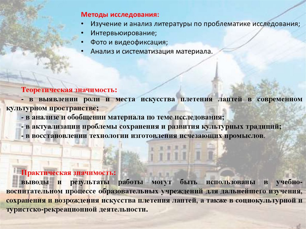 Методы исследования:• Изучение и анализ литературы по проблематике исследования;
