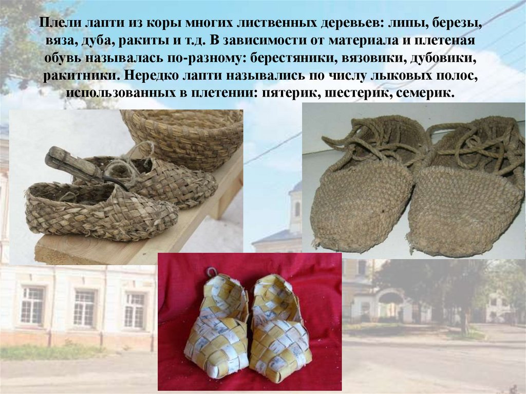 Плели лапти из коры многих лиственных деревьев: липы, березы,вяза, дуба, ракиты и т.д. В зависимости от материала и плетеная