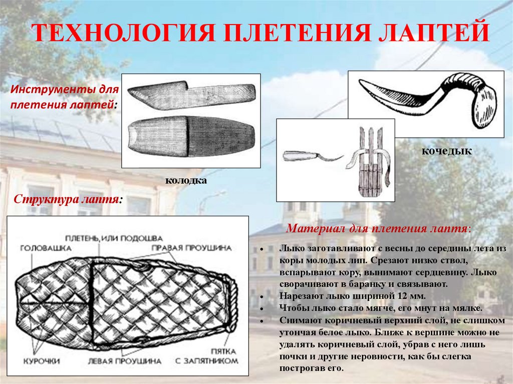 технологию изготовления лаптей можно встретить в сети интернет и справочной