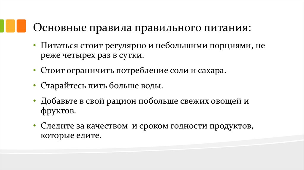 Основные правила правильного питания:• Питаться стоит регулярно и небольшими порциями, не