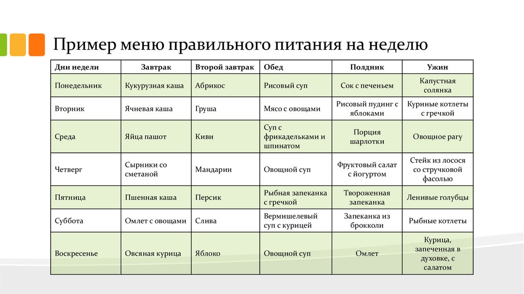 Пример меню правильного питания на неделюДни недели