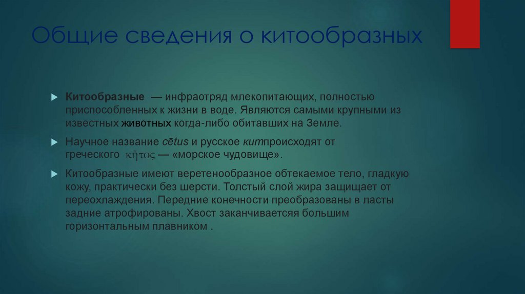 Общие сведения о китообразныхКитообразные — инфраотряд млекопитающих, полностью