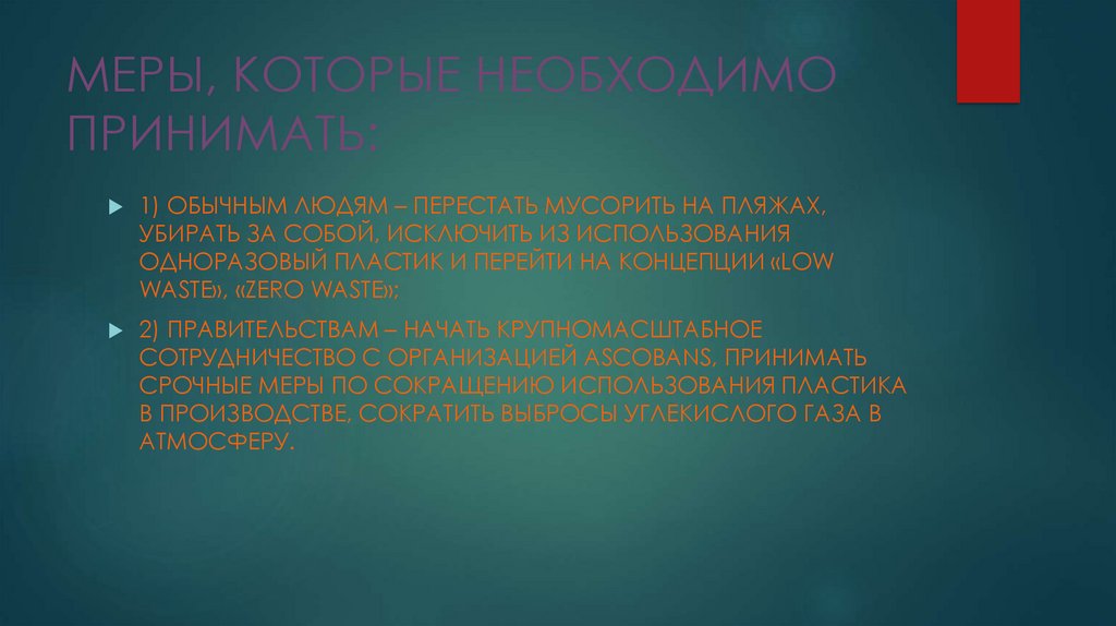 1) ОБЫЧНЫМ ЛЮДЯМ – ПЕРЕСТАТЬ МУСОРИТЬ НА ПЛЯЖАХ,