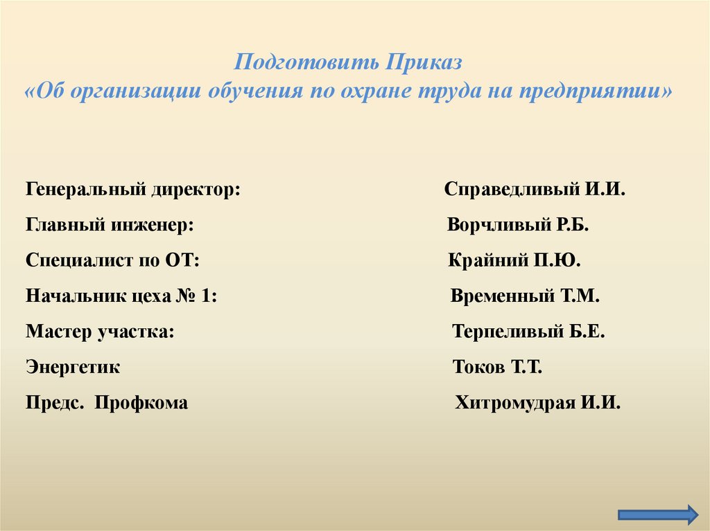 Подготовить Приказ«Об организации обучения по охране труда на предприятии»