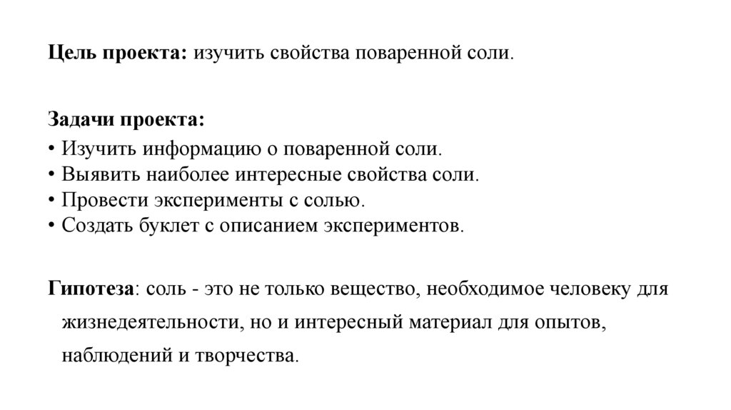 Цель проекта: изучить свойства поваренной соли.Задачи проекта: