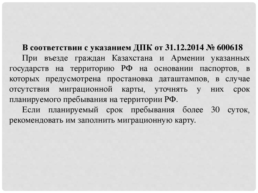 В соответствии с указанием ДПК от 31.12.2014 № 600618При въезде граждан Казахстана и Армении указанных