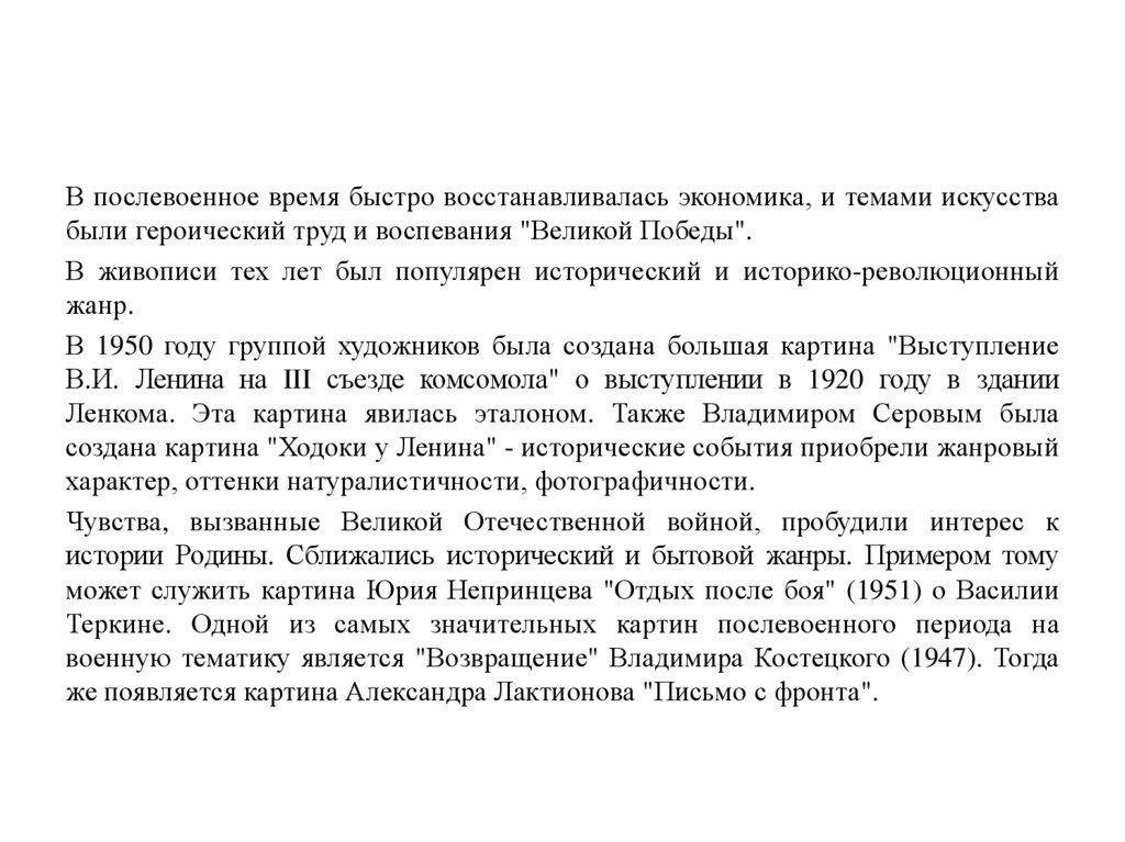 В послевоенное время быстро восстанавливалась экономика, и темами искусствабыли героический труд и воспевания "Великой Победы".