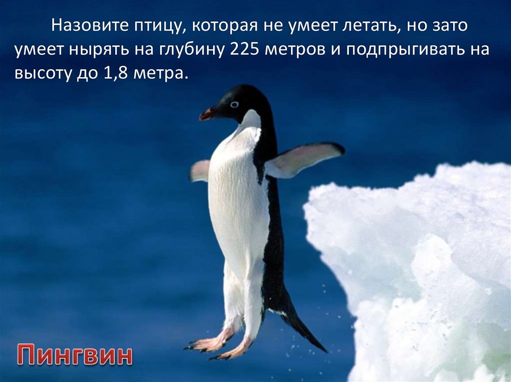 Назовите птицу, которая не умеет летать, но затоумеет нырять на глубину 225 метров и подпрыгивать на