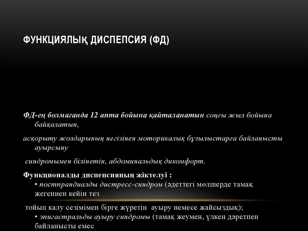ФУНКЦИЯЛЫҚ ДИСПЕПСИЯ (ФД)ФД-ең болмағанда 12 апта бойына қайталанатын соңғы жыл бойына