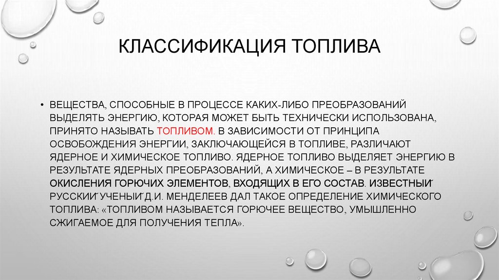 КЛАССИФИКАЦИЯ ТОПЛИВА• ВЕЩЕСТВА, СПОСОБНЫЕ В ПРОЦЕССЕ КАКИХ-ЛИБО ПРЕОБРАЗОВАНИЙ