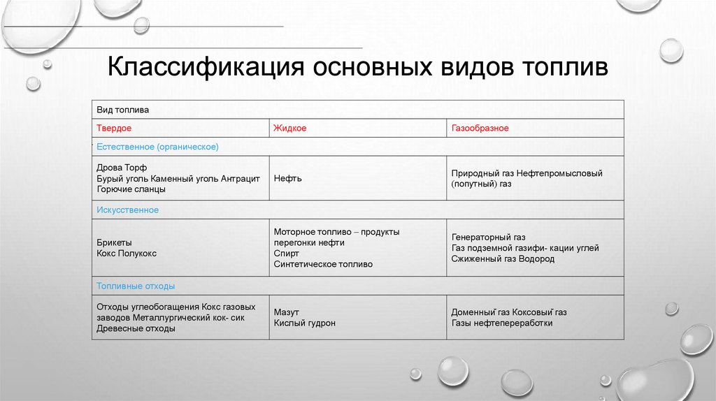 Классификация основных видов топливВид топлива