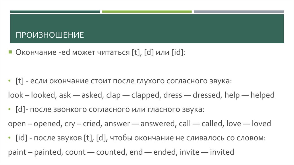 ПРОИЗНОШЕНИЕОкончание -ed может читаться [t], [d] или [id]: