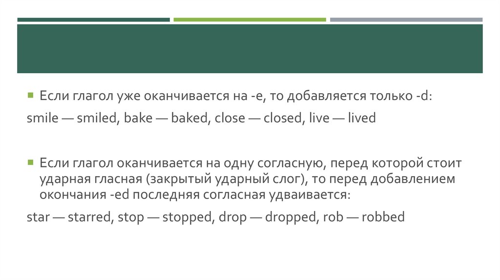 Если глагол уже оканчивается на -e, то добавляется только -d:smile — smiled, bake — baked, close — closed, live — lived