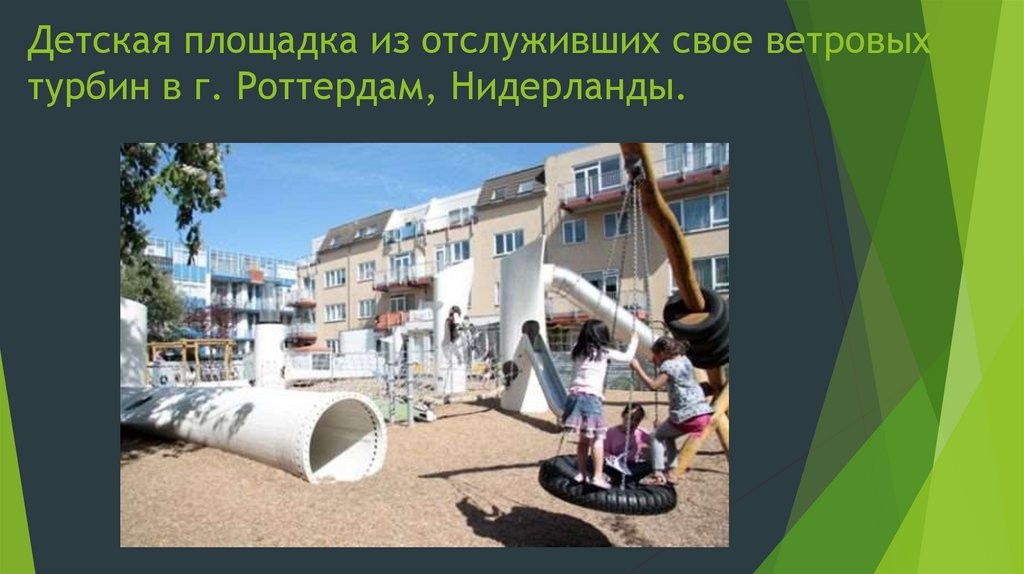 Детская площадка из отслуживших свое ветровыхтурбин в г. Роттердам, Нидерланды.