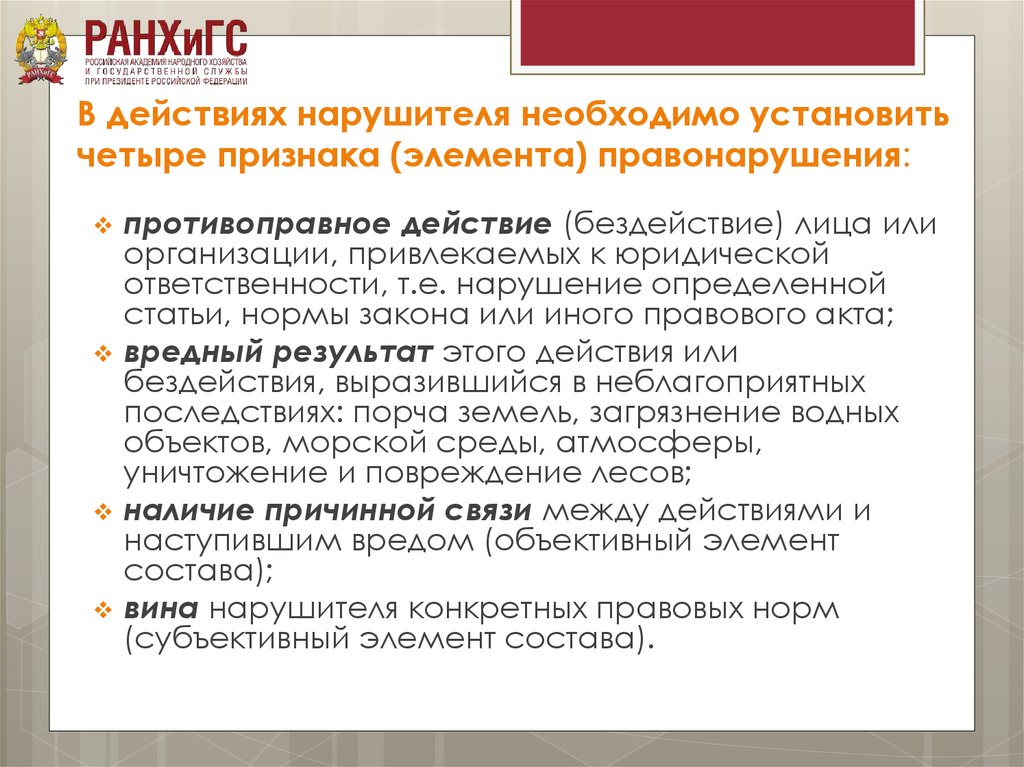 В действиях нарушителя необходимо установитьчетыре признака (элемента) правонарушения: