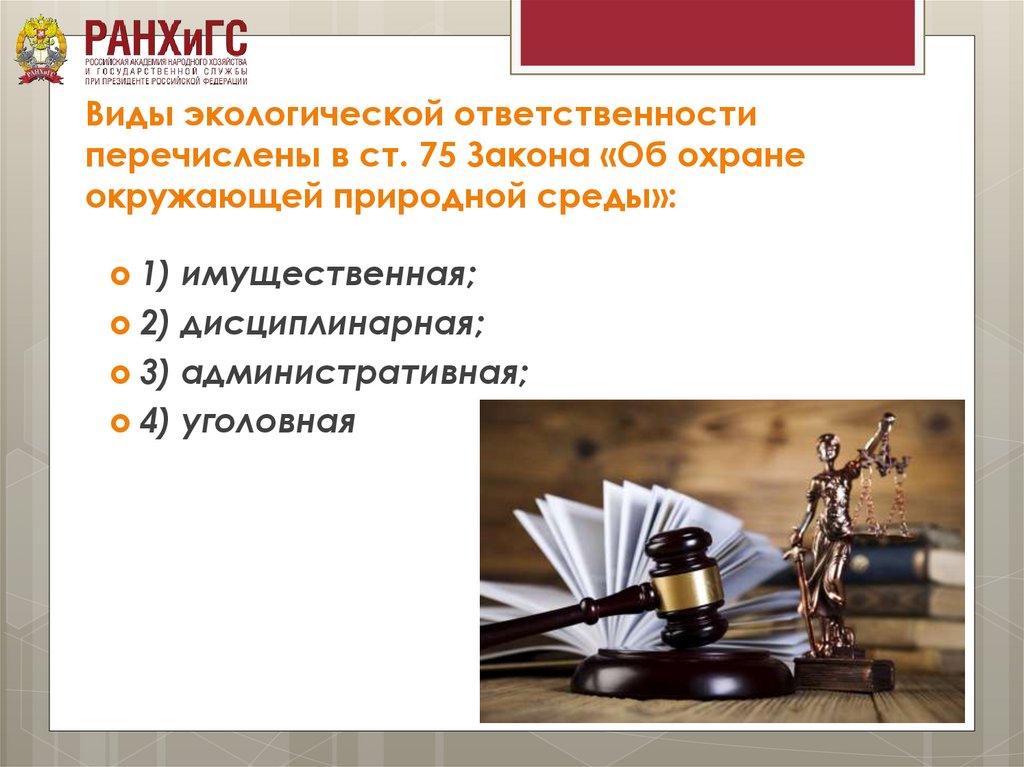 Виды экологической ответственностиперечислены в ст. 75 Закона «Об охране
