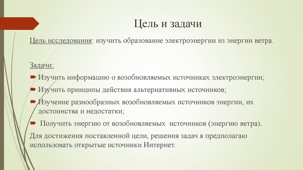 Цель и задачиЦель исследования: изучить образование электроэнергии из энергии ветра.